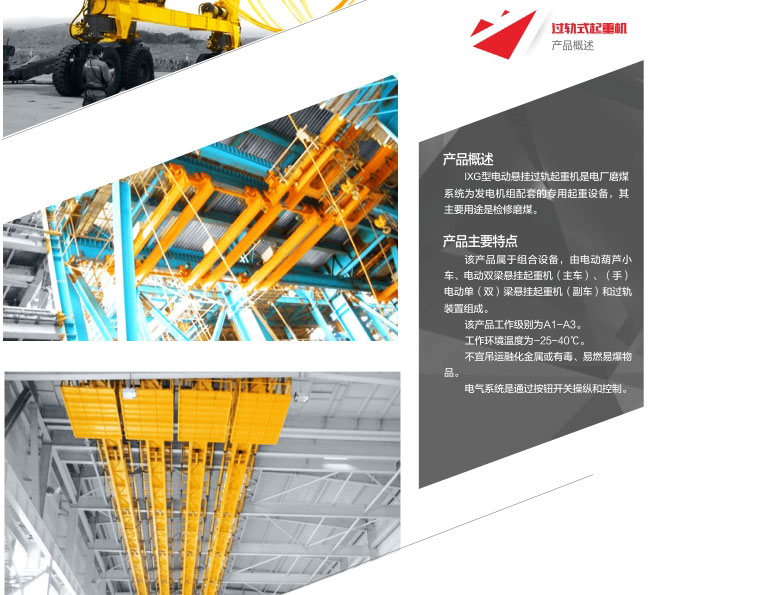 1、 XG型電動(dòng)懸掛過軌起重機(jī)是電廠磨煤系統(tǒng)為發(fā)電機(jī)組配套的專用起重設(shè)備,其主要用途是檢修磨煤。