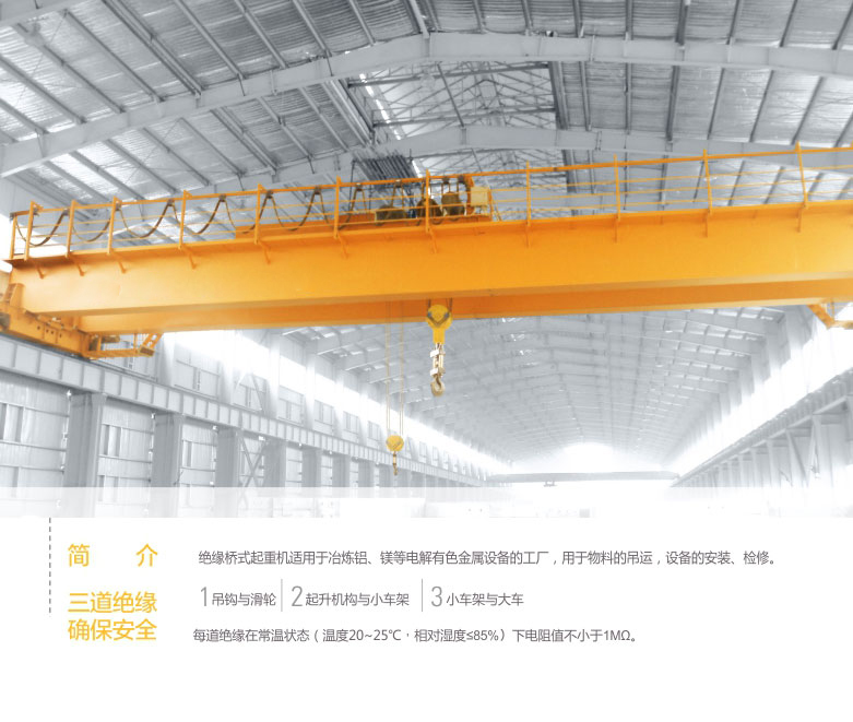 1、 QY型絕緣吊鉤橋式起重機適用于有色金屬電解鋁、鎂、鉛、鋅等冶煉車間。